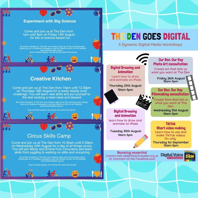 Wednesday 31st August- Our Den, our way film making consultation (create films that tells us what you want at the Den) from 10am-3pm for ages 10-16