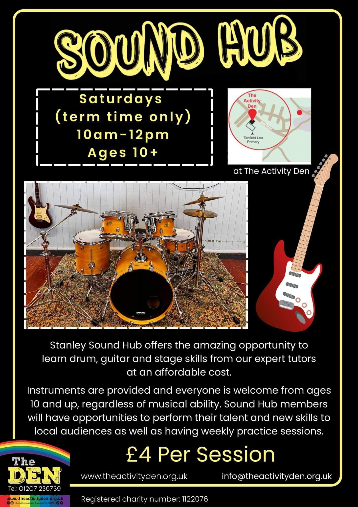 Stanley Sound Hub runs every Saturday during term time at The Den from 10am-12pm. This is an amazing opportunity to learn drum, guitar, vocals and stage skills from our expert tutors at an affordable cost. Check out our Sound Hub feature on the BBC.